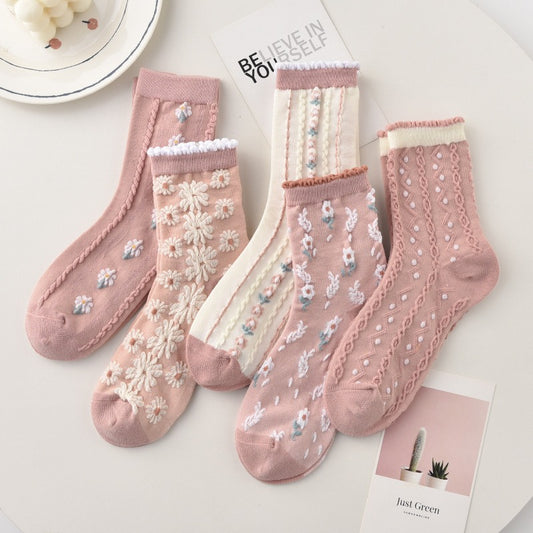 5 Pairs Of Vintage Socks Children's Medium Tube Pure Cotton Fashionable Socks Ethnic Pattern Long Tube Female Socks Spring And Autumn Cotton Socks